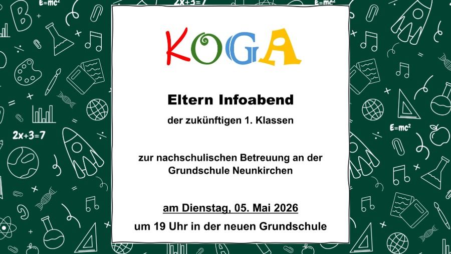 Herzliche Einladung zum Eltern Infoabend der zukünftigen 1. Klassen zur nachschulischen Betreuung an der Grundschule Neunkirchen a. Br. am Dienstag, 05. Mai 2026 um 19 Uhr in der neuen Grundschule.